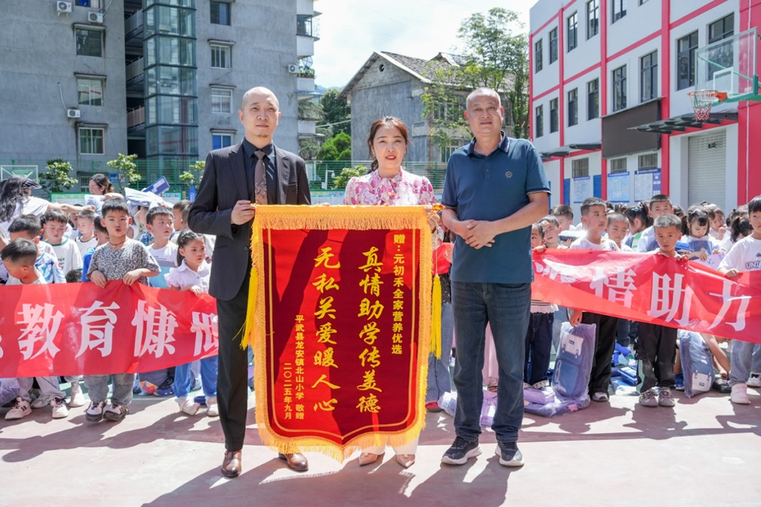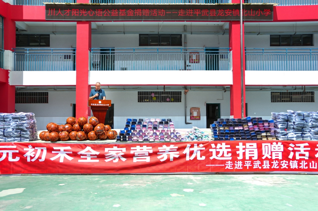 平武县龙安镇北山小学2025年9月1日迎来了一场充满希望的捐赠活动。由海南九鹏初禾科技有限公司董事长段钰鹏、元初禾全家营养优选董事长朱丽女士带队,元初禾全家营养优选联合阳光心语公益基金,带着满满的爱心与关怀走进了这所充满朝气的校园,为孩子们送来了学习和体育用品,助力他们追逐梦想。